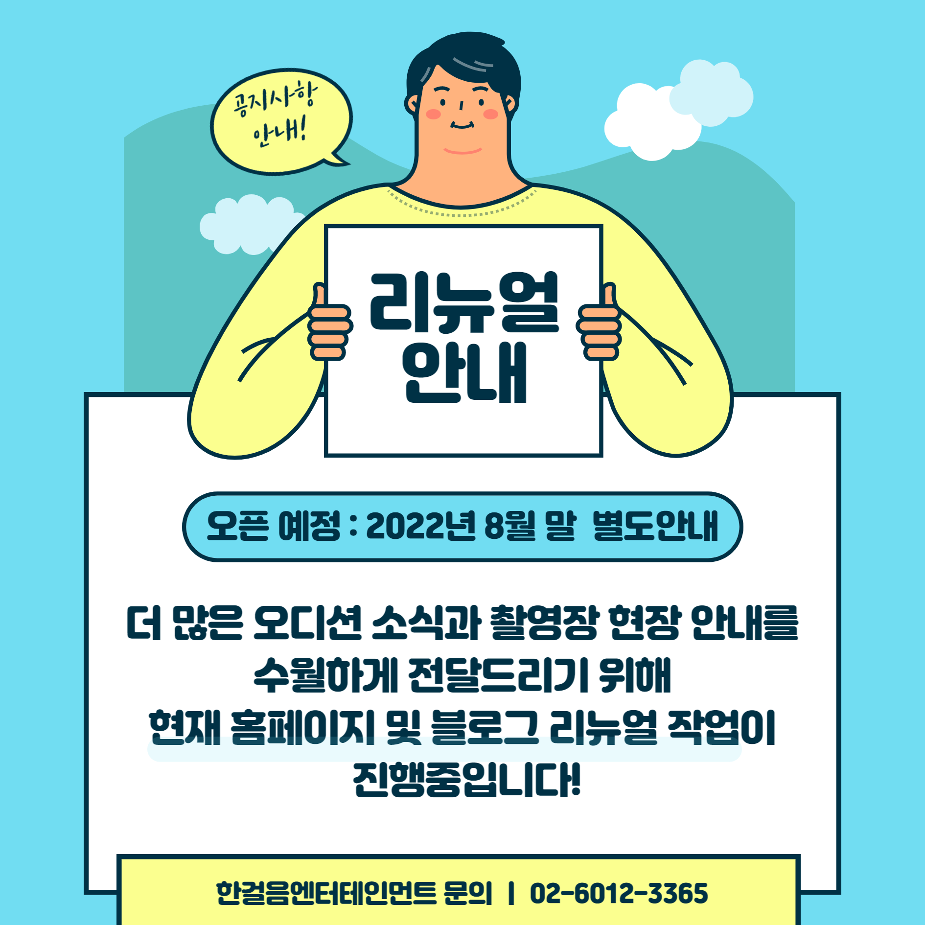 더 많은 오디션과 촬영장 소식, 전속 배우님들의 소식을 알려드리기 위해 현재 블로그 및 홈페이지를 전면 리뉴얼 하는 중입니다.