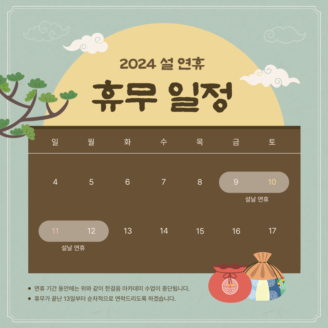 설을 맞이하여 2024년 2월 9일부터 2월 12일까지 한걸음은 쉬어갑니다.